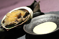 Simmered "Ezo" abalone with "Kombu" puree sauce ("煮蝦夷鮑" 利尻昆布のソース) - the delicious abalone was simmered with some kelp from Rishiri Island. The sauce on the side was made with kelp and egg yolk.