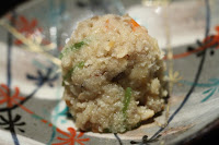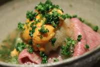 "Wagyu" beef and "Uni" sea urchin on simmered "Aka" eggplant ("とろける赤なす" "和牛サーロイン" "極上生うに" お添えて) - interesting combination, although I must confess that I chose not to have the two main ingredients together in the same mouthful. The sea urchin from Hokkaido was very tasty, and worked really well with the grated radish. The wagyu sirloin was as good as it gets, and the eggplant (apparently from Kyoto) was pretty yummy.