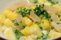 "Sweet corn" steamed "a la minute" on corn egg custard with "Kobashira" clam (蒸したてろうもろこし "小柱" と "とうもろこしの茶碗蒸し" と共に) - Tigger declared that he "can eat this all day", and I understood what he meant. This was simple comfort food made with deliciously fresh ingredients. The corn from Nagano (長野県) was really crunchy and incredibly sweet, the abductor muscles of the clams were pretty sweet themselves. There were some really milky tofu skin (湯葉) along with the sweet corn and egg custard. Add some finely chopped scallions on top and you've got an incredibly yummy bowl.