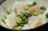 "Soy Beans" Edamame rice with scallop, Okara and miso soup with tofu ("大豆をめぐり"枝豆と帆立の御飯、おから、豆腐の味噌汁) - another simple and comforting dish, although I thought the rice was a tad overcooked and wet.