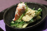 "Kegani" crab with summer vegetables seasoned with wasabi and sudachi ("北海道毛蟹" と "夏野菜" のお浸し すだちと山葵の香りで) - in addition to the leg of the Japanese horsehair crab, there was also a lump of shredded crab meat that had been mixed with what tasted like tomalley (蟹味噌). Also in the bowl were shredded cucumber, eggplant, baby corn, scallion sprouts (芽ねぎ), seaweed (のり) flavored with some wasabi (山葵).