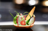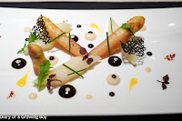 Next up was our amuse-bouche, which was tomato gelée topped with white asparagus espuma, Japanese micro tomatoes, croûtons, and piment d'Espelette. Very refreshing and tasting very much of the spring.