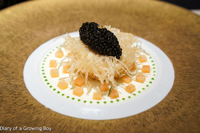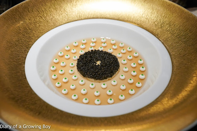 Le caviar impérial et le king crabe rafraîchis d’une gelée de crustacés, légèreté de chou-fleur - this was a kind surprise from the chef, as it certainly was not on our menu. Always a pleasure to have this extremely classic dish, and tonight there were 60 "dots" of cauliflower cream with corresponding parsley chlorophyll "nipples" on top. Absolutely love the shellfish gelée with the cauliflower cream, and of course together with the king crab and Impérial caviar from Sologne. It is pretty much perfect.