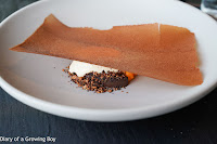 I guess it doesn't get more deconstructed than this... when the apple and the pastry are completely separate. The pastry was certainly very flaky, and it's clear that the very thin ribbons came from a number of different kinds of apples. Finally we have some chili chocolate custard, Alphonso mango with five spice, hazelnut cookie crumble, peanut ice cream, and chocolate chips. Pretty interesting mix.
