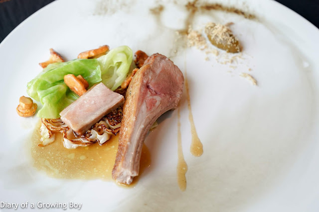 The 3-month-old milk-fed Pyrénées lamb was nice and fatty... and gamey - which was exactly how I like my lamb. It came with cabbage, with a cross-section burnt and then sautéed with butter and ginger. There were also some chanterelles on the side. Served with a white miso and seaweed purée, topped with lamb floss.