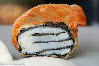 Beignet with Hokkaido scallop, black truffle, and seaweed - cutting open the crunchy beignets revealed the gigantic Hokkaido scallops stuffed inside. These had been scored and encased with slices of black truffle from France, then wrapped with nori (海苔) seaweed before being battered and deep-fried.