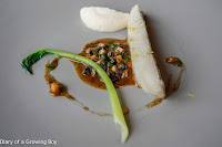 Turbot from Brittany - served with Japanese turnip (蕪) leaves, turnip purée, soy sauce jus with diced tofu and bigorneaux. Even with the citrus zest on top, the turbot needed the heavier flavors from the condiments.