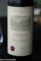 2002 Araujo Cabernet Sauvignon - decanted for more than 45 minutes prior to serving. Nose of vanilla, coconut butter, pencil lead, ripe fruit, and smoke. Fragrant and beautiful. Tannins are still here, with a long finish.
