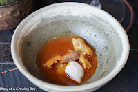 The ubiquitous abalone liver sauce came on the side. This version was made with mustard and soy sauce - and was slightly too salty and surprisingly not sour. We also had dashi (出汁) made of eggplant, which showed sweetness and good balance. Overall, a pretty good dish.