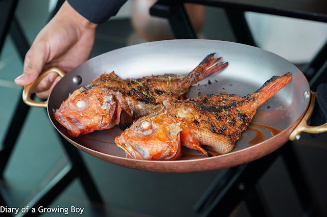 It was, of course, very delicious. The fish itself is fatty and succulent. The fillet was served with a compote of vegetables, yuzu (柚子), and seafood such as conpoy (瑤柱). The accompany sauce was made with Dolcetto d'Alba. The collar, with pectoral fin attached, came separately with some lime.