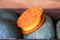 Japanese pumpkin - a mix of pumpkin purée and cream is sandwiched between two discs of pumpkin crisps.