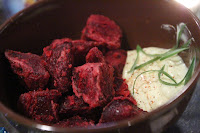 Home beet fries: deep fried roasted beets, sweet chilli mayo, green onion - I needed to fulfill my veggie quota for the meal, so I took a few pieces but removed the thin layer of batter on the outside. I liked it more than I thought I would. Didn't touch the mayo, of course...