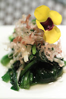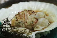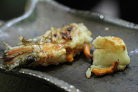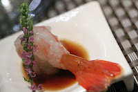 Shrimp (Botan shrimp 牡丹海老?) with perilla (紫蘇) flowers - the shrimp was pretty tasty, and somehow the combination of shrimp, soy sauce and a sip of Champagne transformed the bubbly into something that was sweet with caramel flavors.