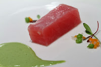 Marinated tuna with haricots verts and sorrel - I wasn't expecting a bloc of raw tuna this size, but it turned out to be very tasty. The garnish on the side was especially flavorful.