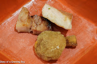 Searedn A5 Hida beef sirloin, lotus root mochi with sesame sauce (飛騨牛 A5サーロイン炙りと蓮根餅 胡麻ソース) - the slice of sirloin was draped over a chunk of deep-fried mochi (餅), and came with a sesame sauce mixed with vinegar jelly. Finally there was some almond shavings and finely diced spring onions. Pretty nice.