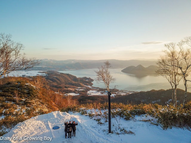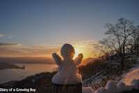 There was still some cloud cover above the mountains, but the light turned out to be pretty nice once the sun rose... especially when it illuminated the top of Mount Yotei (羊蹄山). Someone had made a tiny little snowman and placed him on top of the fence, so Hello Kitty and I tried to take snaps of him against the rising sun.I had told the ladies that we should take a "drone selfie" before we leave, so I took them to the parking lot where I was flying my drone yesterday, and launched from the same spot. My newly replaced drone had only been hovering at a low altitude for a couple of minutes before it suddenly lost GPS signal and started to drift away over the cliff. Fuck! This was my second episode in as many days, and I panicked for a brief moment. Thankfully the drone maintained connection with the remote control, so I was able to maneuver the drone back above the parking lot - where it regained GPS signal. We managed a couple of selfies as well as short videos, then packed it in.