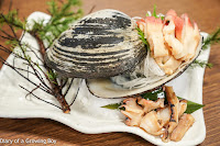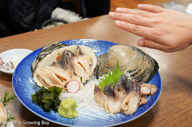 I saw some huge surf clams (北寄貝) in the tanks below, so we picked out three of them and had two served raw.