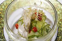 The amuse bouche was marinated cucumber slices with feta cheese and tiny diced cubes of chorizo.
