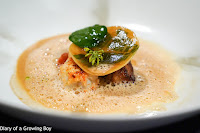 King crab tiramisu, marinated tandoori fruits, Marscapone cream - my initial reaction - clearly based on my hazy memory - was that this had shrunk in size on the way over from Bangkok. But after checking my photos from a few months ago and referencing the size of the chives and chili powder, I wasn't sure I was right. Vincent did tell me that they brought the molds from Bangkok, so I guess if anything actually shrank, it was probably my brain...