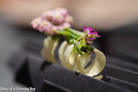 Iwashi - the raw fillets of sardines from Osaka Bay sat on top of a bed of local peas, pickled cucumbers, elderflowers, and elderflower oil, and elderflower cream. While the sardines were delicious and the elderflowers delivered lovely floral notes, the peas were simply too raw and green. It's a shame because had they cooked them a little more and brought out the sweetness, it would have been an awesome dish.
