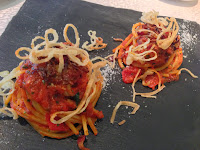 Spaghetti alla chitarra all' amatriciana - I needed some carbs, so chitarra it is. Unfortunately they weren't about to offer me the simple pomodori spaghetti that I always get a few floors down, so I took the fattier version made with pecorino and guanciale… Thankfully there wasn't a lot of guanciale, and I made sure to take out all the deep-fried onion rings that was used as garnish on top. This was pretty good, as the pasta was certainly al dente.