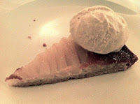 Finally, a little piece of pear tart for everyone. If someone had asked me, I would have dispensed with the scoop of ice cream as I really didn't need the calories. And to me, adding a scoop of vanilla ice cream to a piece of pie really doesn't add that much value, unless of course, it's actually not vanilla ice cream… I pushed the ice cream to the side with my spoon, licked it, and realized it was salted caramel. This I will eat…