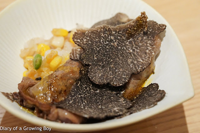 Of course it gets the usual treatment with the egg sauce over rice, except today it ain't plain old steamed rice, but the delicious version with corn and edamame. On top of that, we got slices of black truffle. Can't complain!