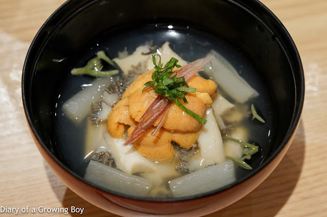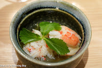 Aomori-style simmered abalone with sea urchin - the ichigo-ni (いちご煮) was made with slices of South African abalone topped with sea urchin, along with some taro stem (芋茎), watershield (蓴菜), shredded myoga (茗荷) and perilla leaves. This was nice and offered a good contrast with the previous dish in terms of temperature and more subtle flavors, but I would agree with DaRC that it was just a little too busy. We didn't need both myoga and perilla for the aromatics, and either the watershield or the taro stem would suffice in terms of added texture.