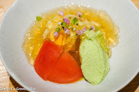 Chilled Japanese snow crab, edamame mousse, Amela tomato - the Japanese snow crab (ズワイ蟹) from Hokkaido had very rich flavors and tasted of the ocean - very savory. The edamame (枝豆) mousse was rich and creamy, and added a little sweetness along with light, green, vegetal flavors. The Amela tomato (アメーラトマト) came with some ripeness along with acidity, and finally the ponzu (ポン酢) gelée delivered enough acidity to balance out the ocean from the crab. Aromatics from perilla flowers for that final touch. A great start to our evening.