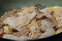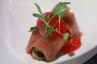 Next came something that didn't seem to be on the menu, and as this was comped and our server didn't bother to tell us what it was, I had no idea… What I did know was that it wasn't something I would normally order, since there was clearly a piece of fatty tuna belly, along with tuna chunks, eggplant and tomato. Normally I'd offer it to my fellow diners since I'm avoid any kind of tuna that could be bluefin, but I was dining with No Fish… so I ate it and tried not to feel guilty about eating this tasty morsel.