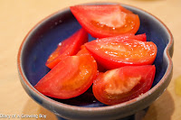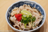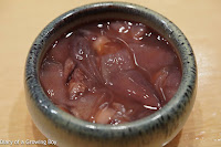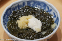 Vinegared seaweed (もずく醋) - with some grated mountain yam (とろろ) in addition to grated ginger. Nice and acidic to whet one's appetite... although I suspect that wasn't in the least bit necessary in our case.