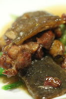 Braised mountain turtle with Chinese lettuce (紅燒山瑞跟唐生菜) - hmmm I haven't had turtle in a long, long time… in fact not since the last dinner where the menu was set by the owner's daughter. This time the turtle wasn't shredded and stir-fried, but I thought it was pretty good. The gelatin-like pieces were actually the softer "skirt" of the turtle shell, which was kinda interesting. Braising with garlic cloves and crispy pork belly naturally provided lots of rich flavors…