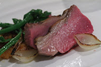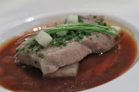 The tuna belly (I didn't ask what kind of tuna) was obviously a little fatty. There was brunoise of what I thought to be bamboo shoots on top, finely chopped spring onions as well as spring onion sprouts. The garlic oil was very fragrant, and the pinot noir provided some acidity against the fatty elements.