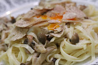 Fettucine with butter sauce, shimeji mushrooms, 62° organic egg and white truffle from Alba - FAIL. This failed on so many fronts it's not even funny. If there was any doubt about whether the statement "I'm not a good cook" is true, I think this just about settles it. Mom thinks I got the proportions between butter and milk wrong (I was scared to use too much butter), and I also under-seasoned the sauce. I also cooked too much fettucine for us, which meant there wasn't enough mushroom.