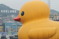 For the last few days I had seen news reports about how dirty Ducky's gotten. Keelung is a narrow harbor with lots of ships passing through, and the wet weather over the last couple of weeks meant all that pollution got stuck on Ducky's body. Crews have been working hard to scrub Ducky clean, but it hasn't been easy. Sure enough, large areas were still kinda blackish, and one half of Ducky's face was cleaner than the other half... Poor Ducky, got so dirty after only 10 days...