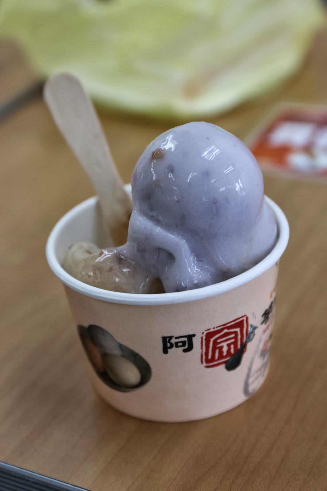 While I lined up for the scallion pancakes, the parental units noticed a long line at the ice cream shop nearby, so they lined up for some taro ice from Ajon Babu (阿宗芋冰城). Babu (叭撲) is the traditional Taiwanese-style ice, which is smooth and a little more watery compared to dairy ice cream. Basic package here gets you three different flavors, and taro, peanut and red bean was chosen. Unfortunately I didn't grow up on babu and actually prefer ice cream, so I found this a little bland. My first couple of spoonfuls were so bland I wasn't sure what I was tasting... I needed to take in a few chunks of peanuts and red beans to distinguish them.