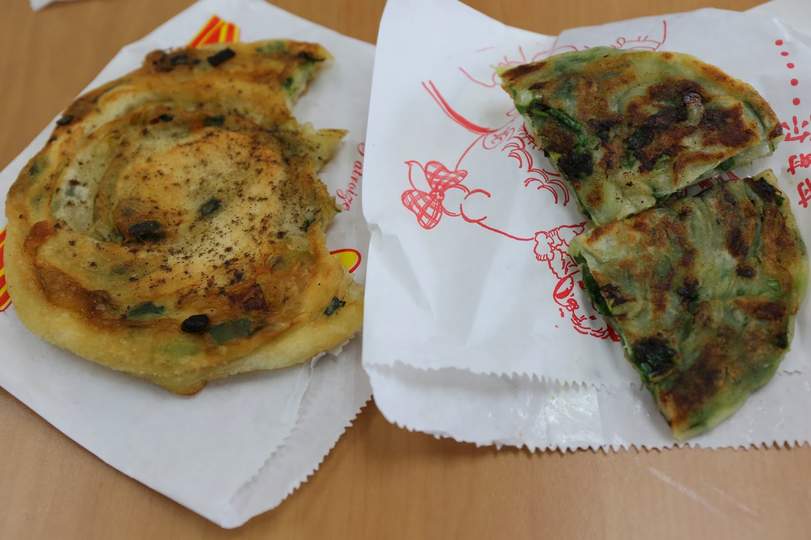 The one from Shunfa (on the left) was deep-fried in a shallow pool of oil, which meant it was crispier on the outside from higher heat. However, there was very little scallion in the dough, and as a result relied much more on the optional pepper seasoning and/or chili sauce for flavor. The other pancake (on the right) was cooked a la plancha where the cook ladled on spoonfuls of oil periodically. The texture was a little soggier, but this was also partially due to the abundance of scallion filling inside. The scallions also meant this version was significantly more salty, and more traditional in flavor.