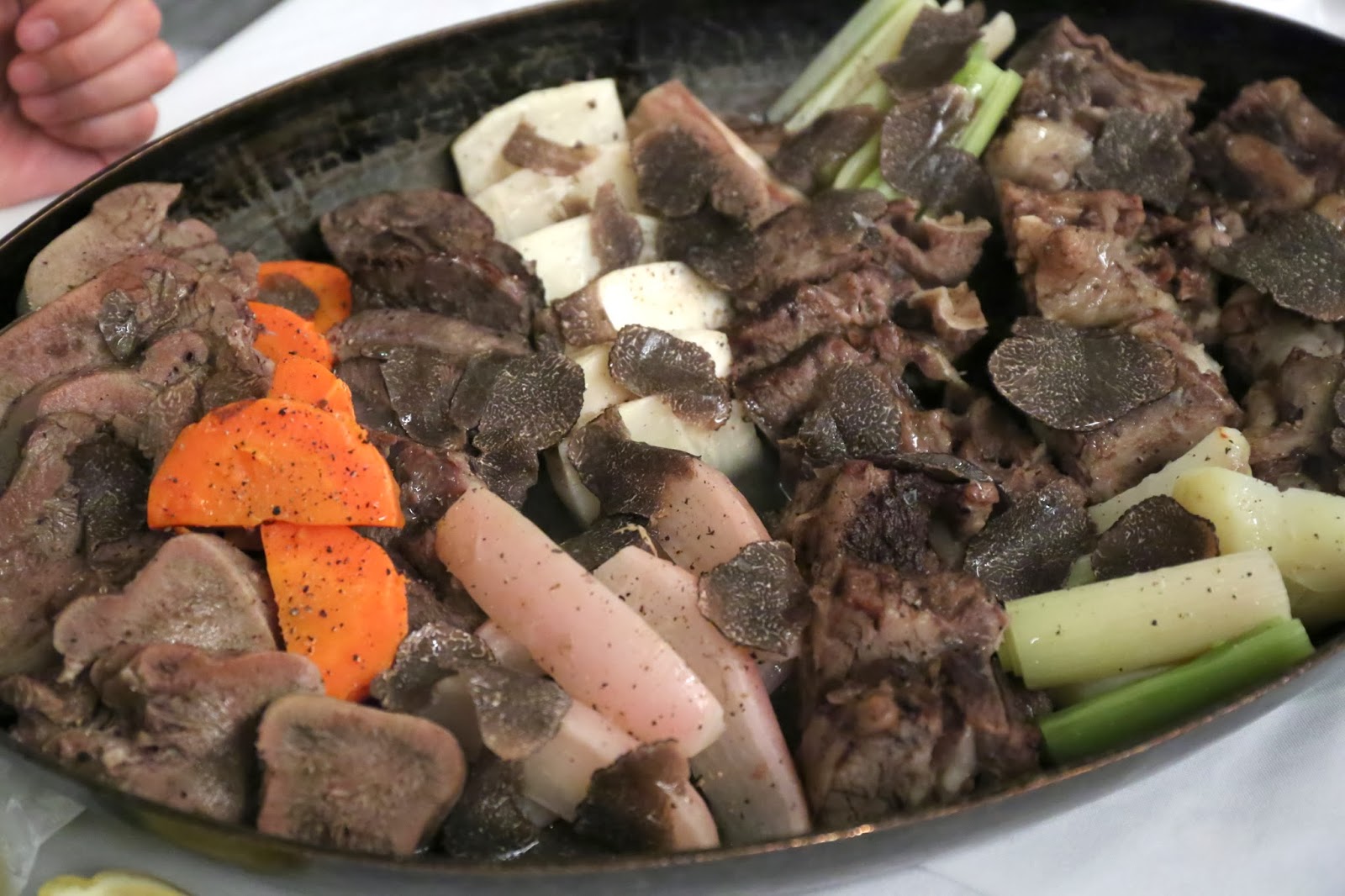Pot au feu - I asked for this because it's perfect for big groups like ourselves, and tonight once again they served it up in two separate pans. There was brisket, ox tongue, ox tail and other yummy cuts of beef, but missing my beloved bone marrow. What was also missing was the usual whole foie gras, but there was enough black truffle to make it up in the luxe department. The accompanying veggies like carrots, turnip and leeks were all delicious, as they'd been absorbing the beefy flavors during the cooking process. Needless to say doggy bags were brought out to pack up what we couldn't finish...
