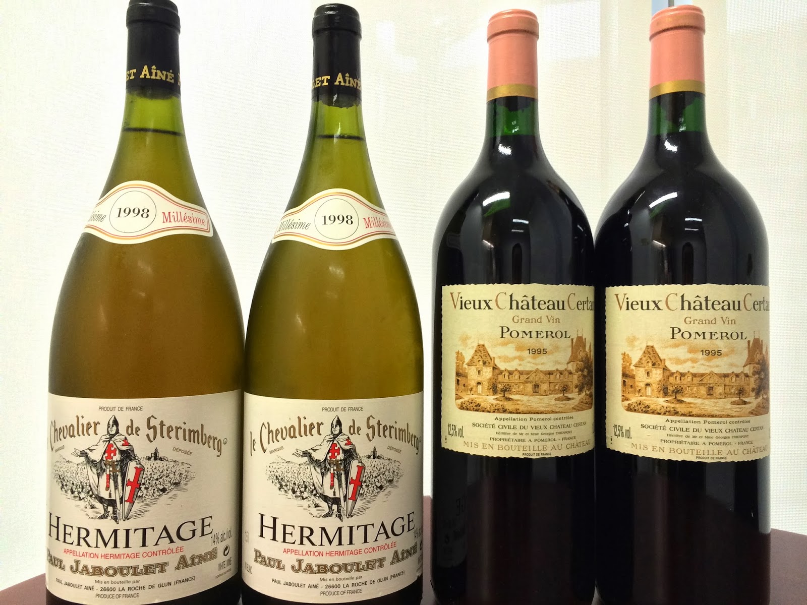 1998 Paul Jaboulet Hermitage Blanc Chevalier de Sterimberg en magnum - initially pretty weak on the nose, perhaps because it was too cold. Showed slight hint of grass, but later displayed oaky notes. Body was initially also light but developed with aeration, with decent acidity.
