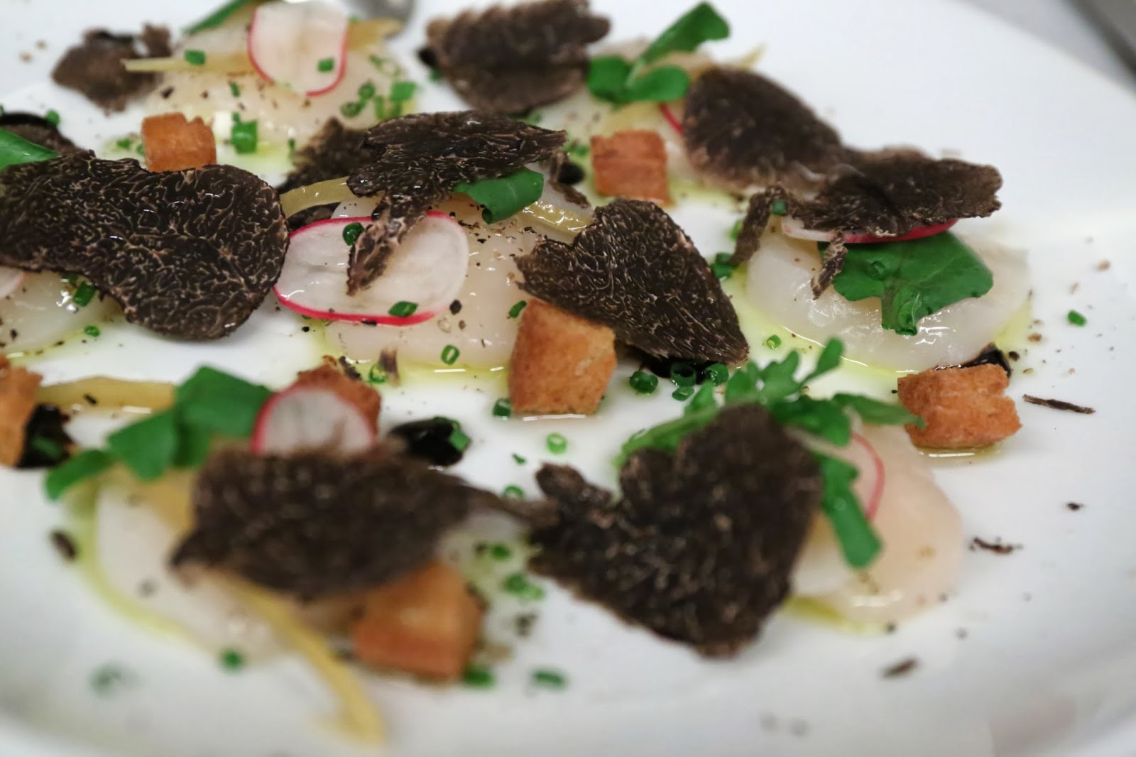 Scallop carpaccio with black truffles, beet root and croûtons - yum.