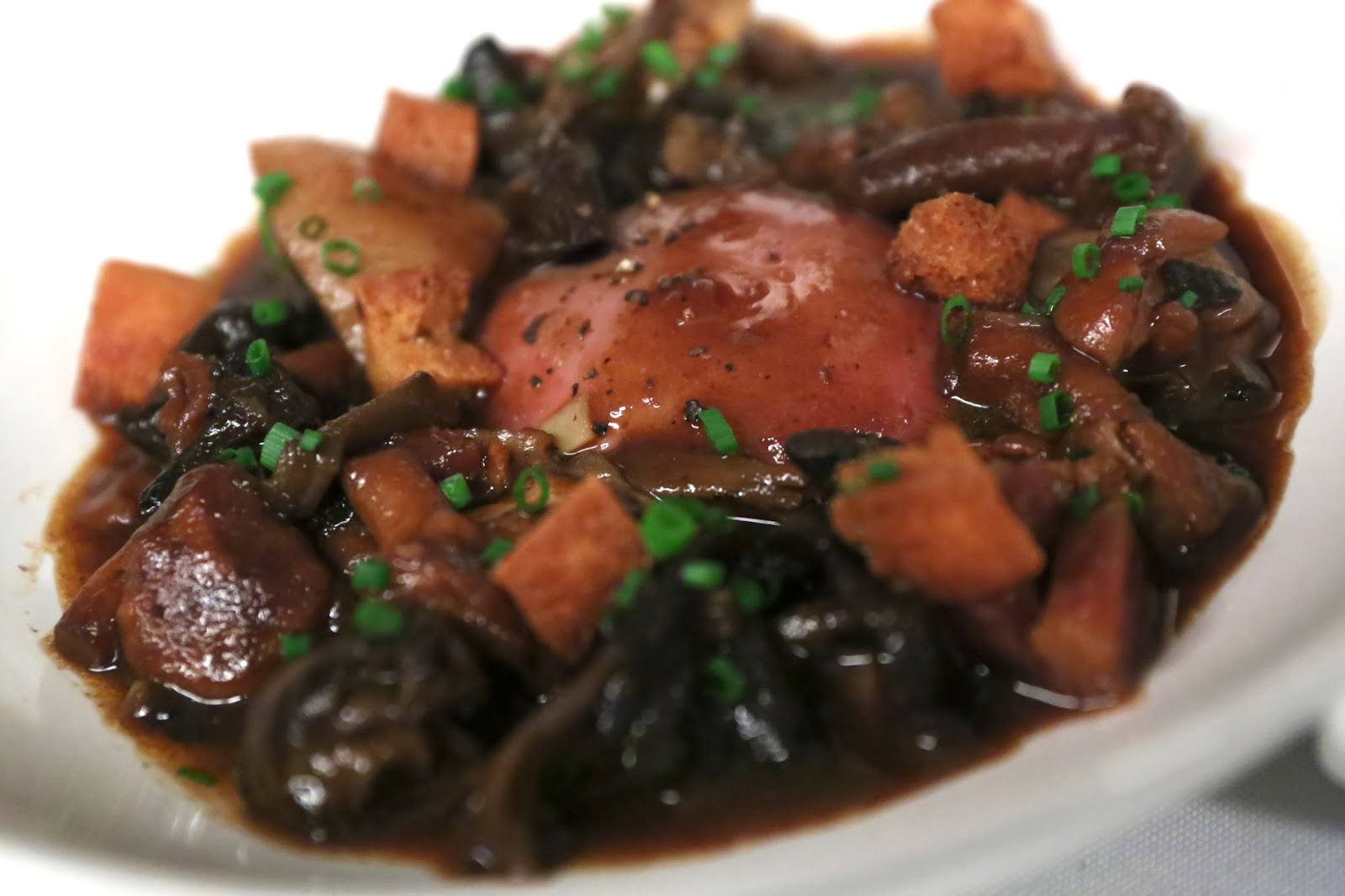 Soft-boiled egg with escargot, pig's ears, oysters, lardons and mushrooms - all done in red wine sauce. There's a lot going on here, but I love it. Epitomizes what I love about David's food - you'll never see it on the menu of a fancy schmancy restaurant, but I'd take this dish any day.