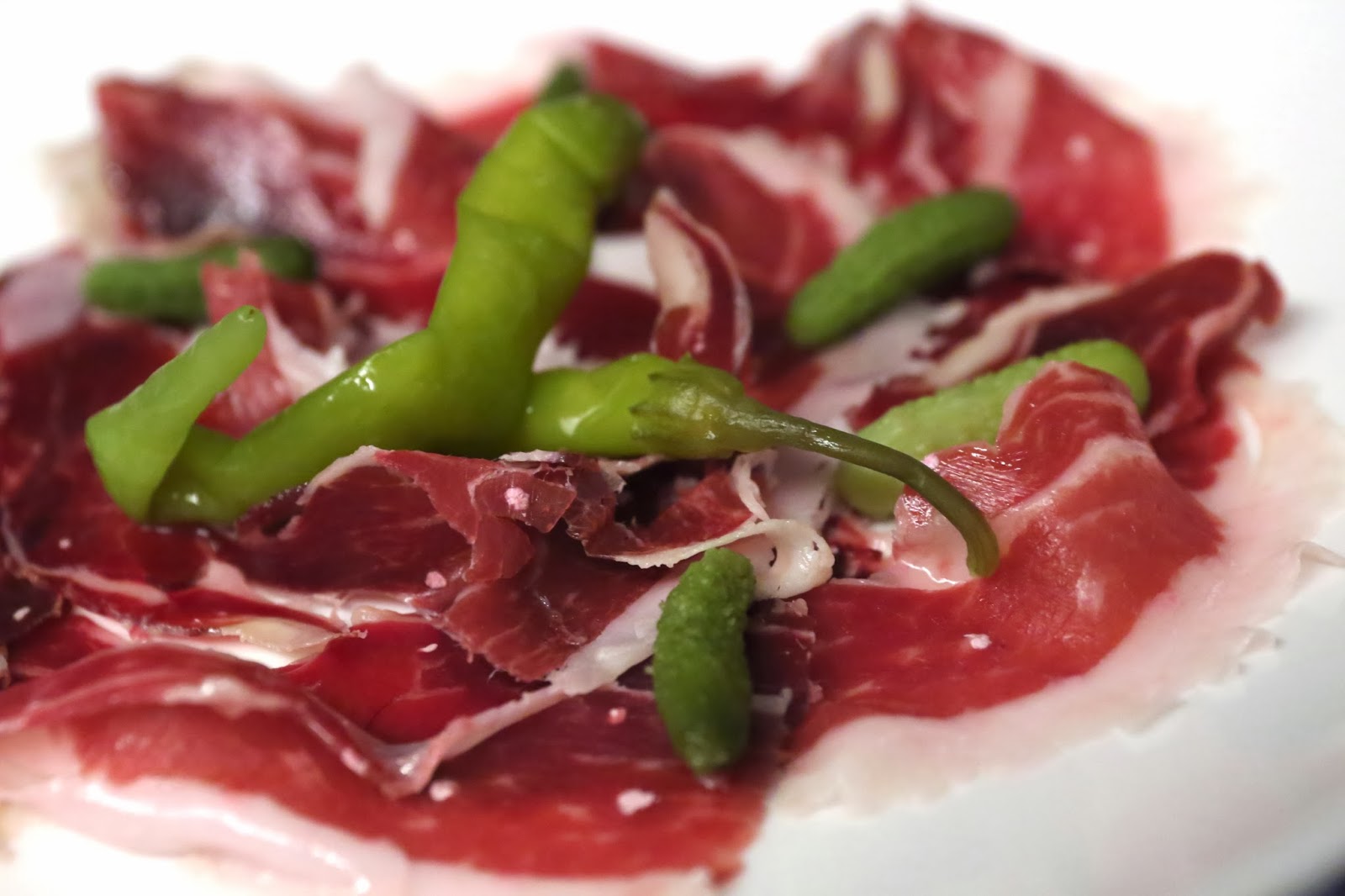 Jamón ibérico, aged 48 months - pretty yummy. You can see the specks of protein crystals that come from aging. Served with pickled peppers and cornichons.