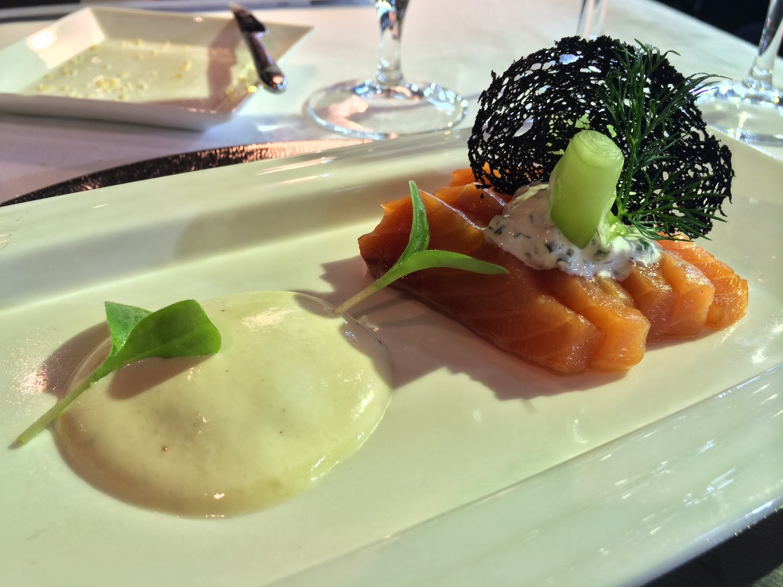 Baltic salmon, herbs cream, potato foam, croutons - this was very delicious. The herb cream was so yummy... and the potato foam, too. We were off to a good start...