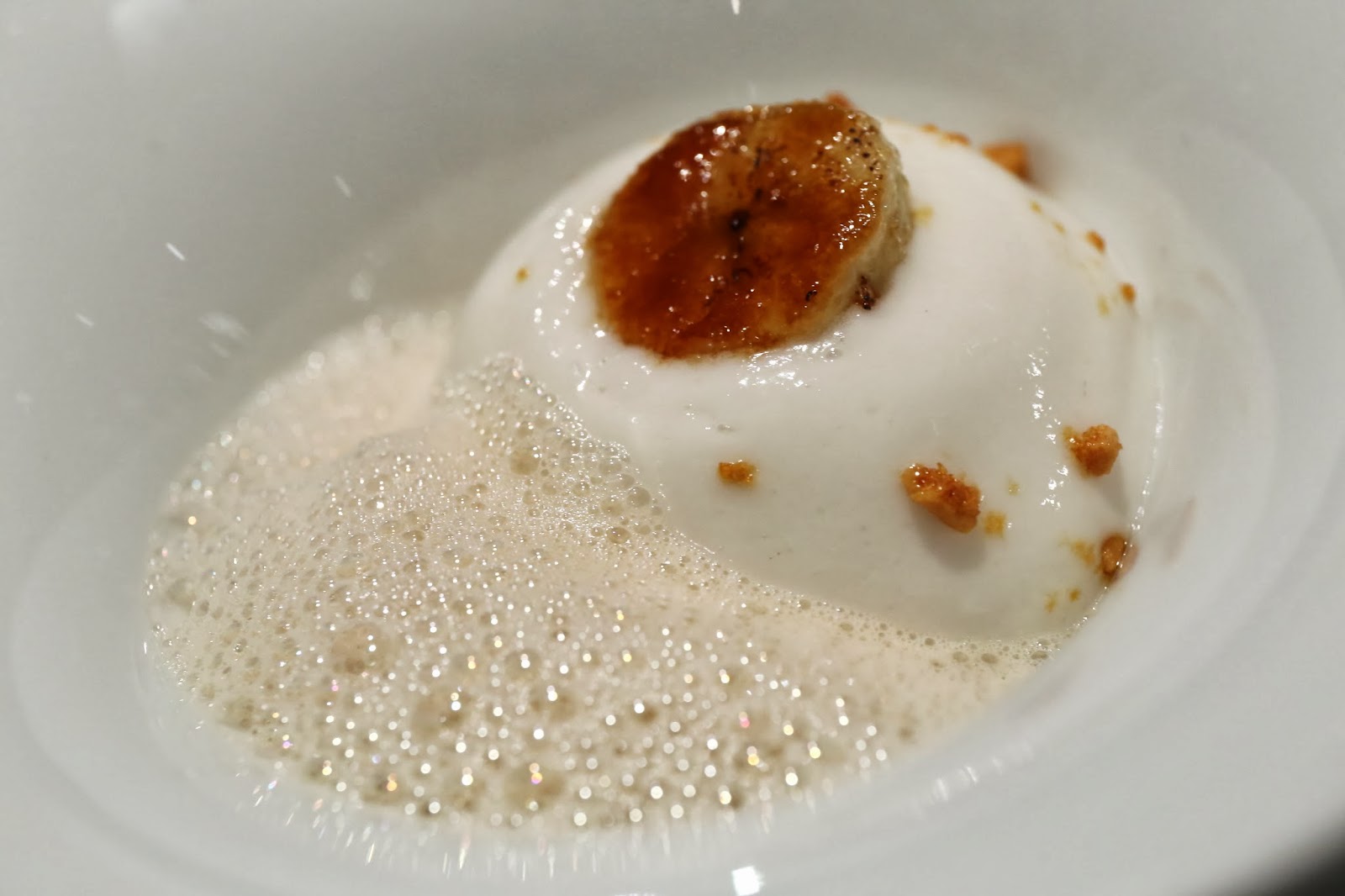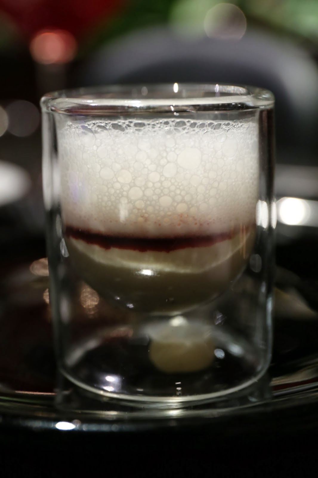 Our amuse bouche had foie gras custard at the bottom, with Port wine reduction in the middle and topped with Parmesan foam. A nice start.
