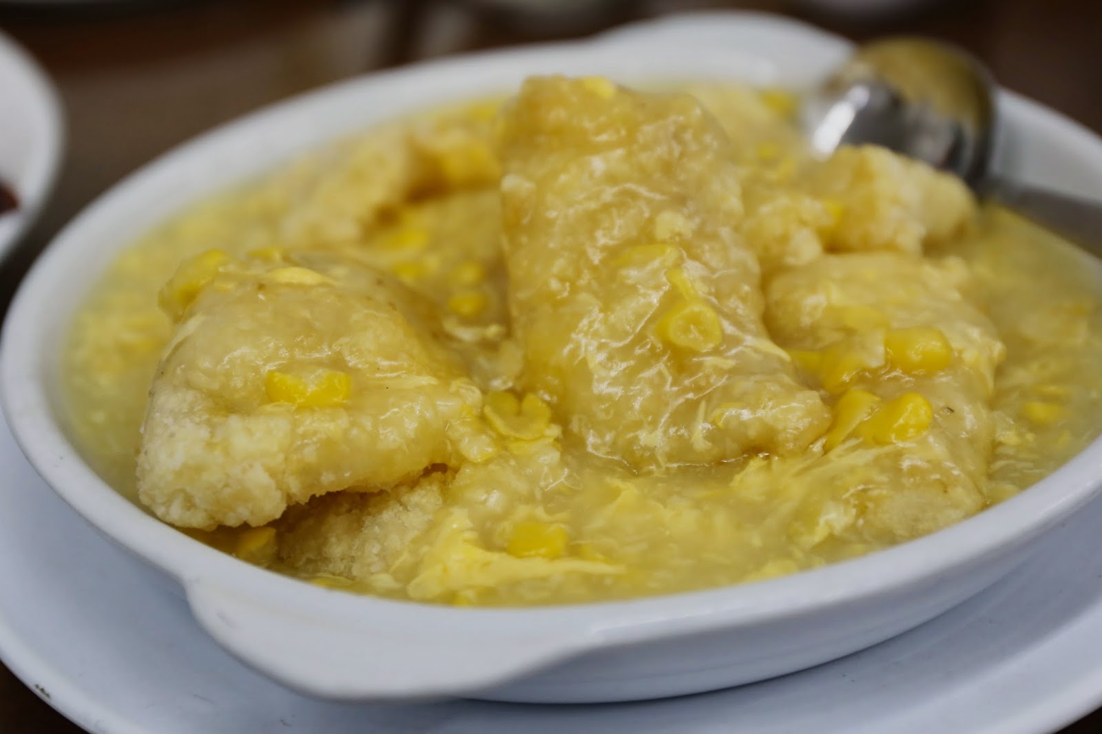 Deep-fried garoupa fillets in corn sauce (粟米斑球) - a classic dish. What's not to like about something that's been battered and deep-fried?