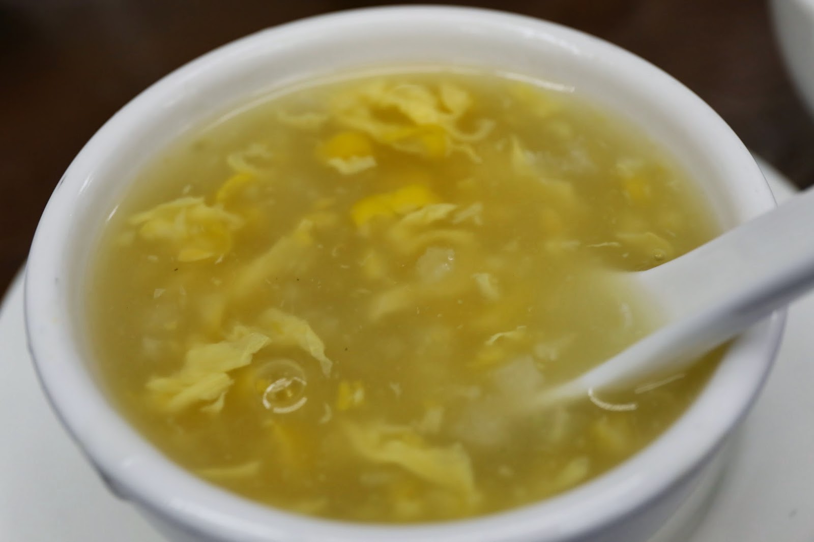 Corn and egg drop soup (粟米湯) - nice to have a bowl of hot soup today. Interesting that they added chopped fish maw (魚肚).