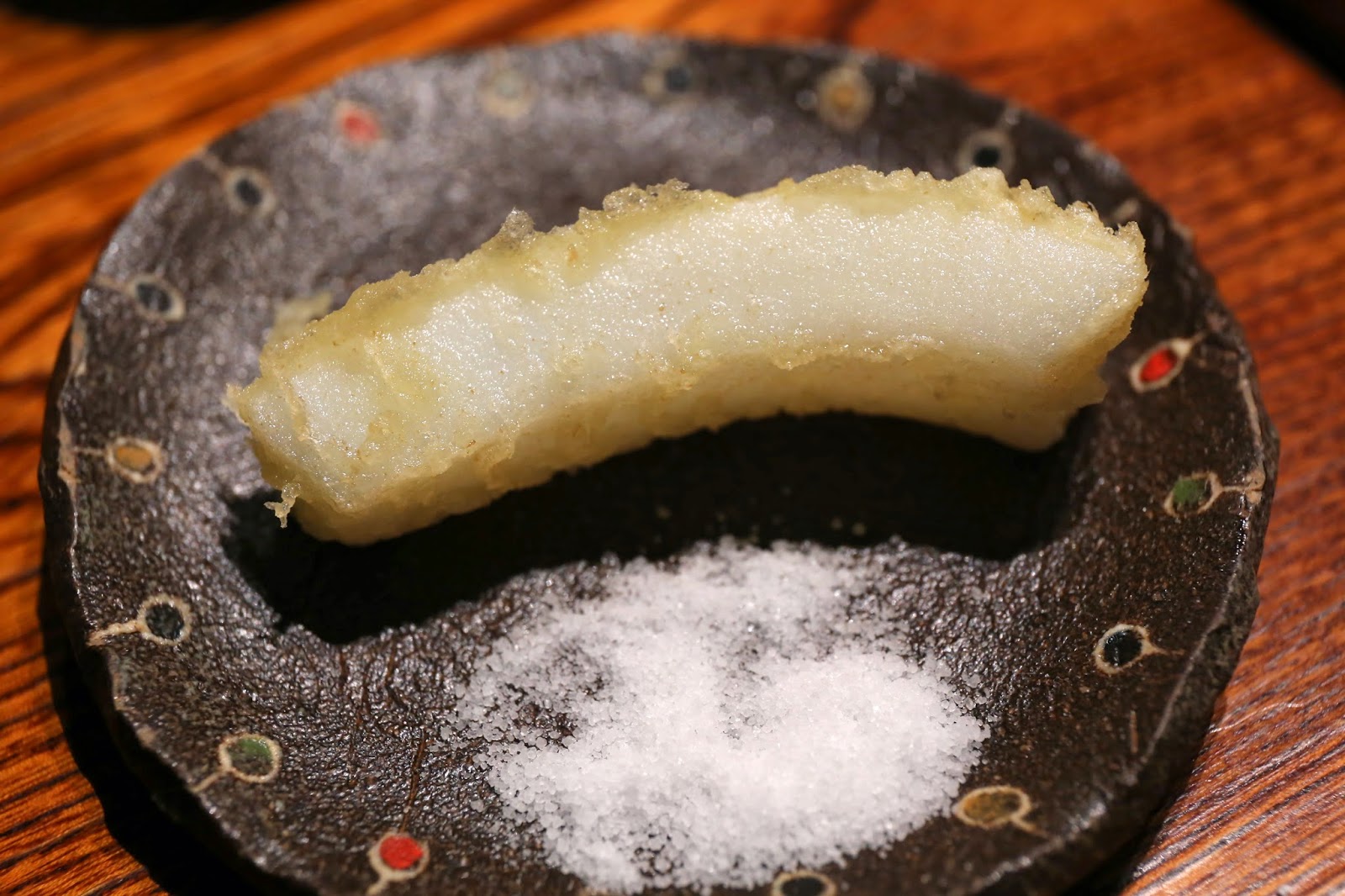 Sweet potato (薩摩芋) - I suddenly remembered that sweet potato tempura is supposed to be a specialty at some tempura restaurants, so I felt compelled to add this item. Pretty good, but not exactly mind-blowing like I had expected from the hype others had made about sweet potato tempura. Zhang-san cut a slit on each side before battering.