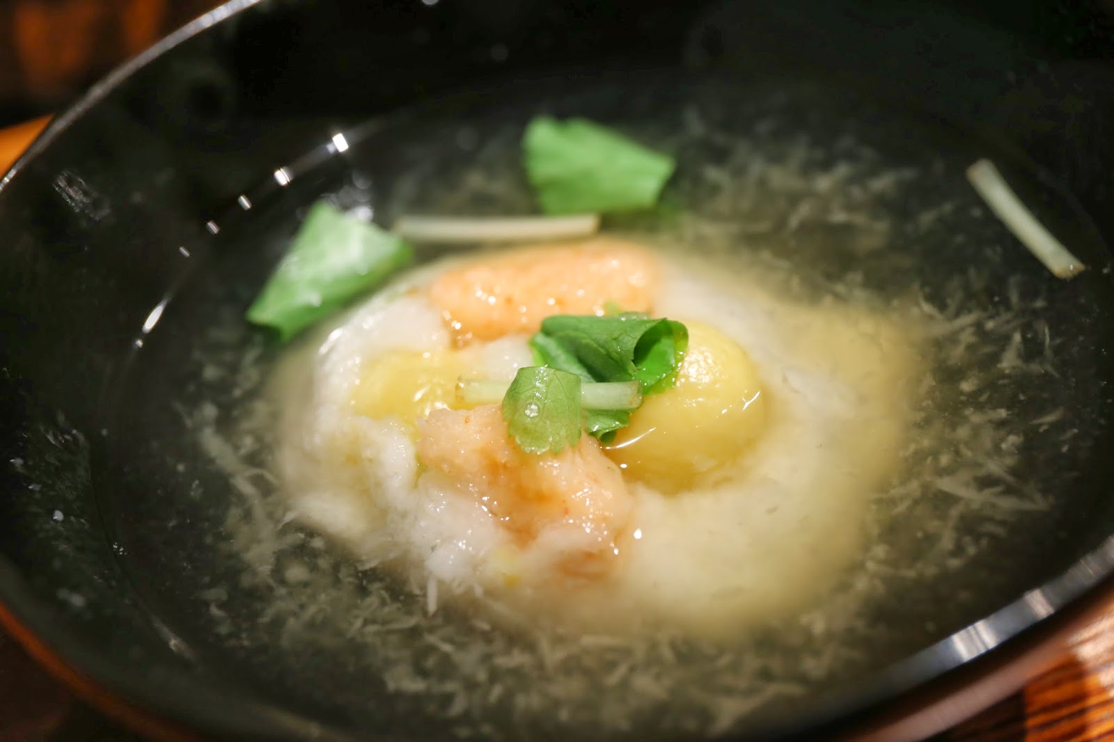 Steamed radish, prawn paste and ginkgo nuts - very interesting that this should be made with a pile of grated radish (大根おろし).
