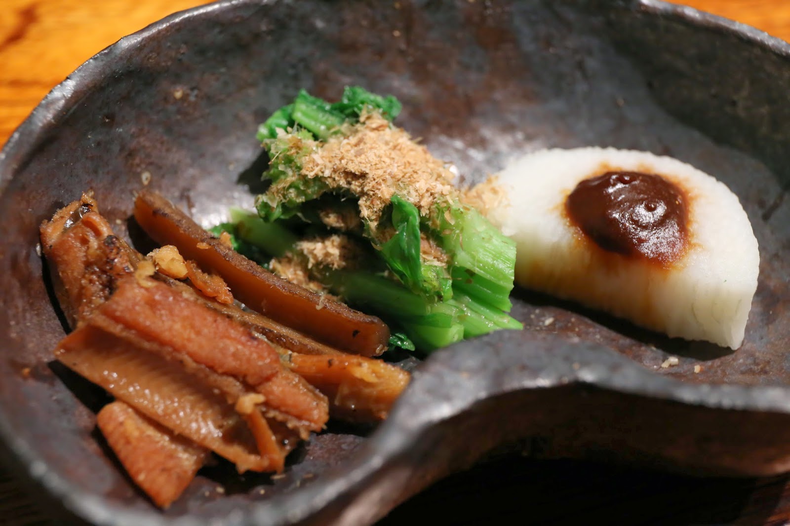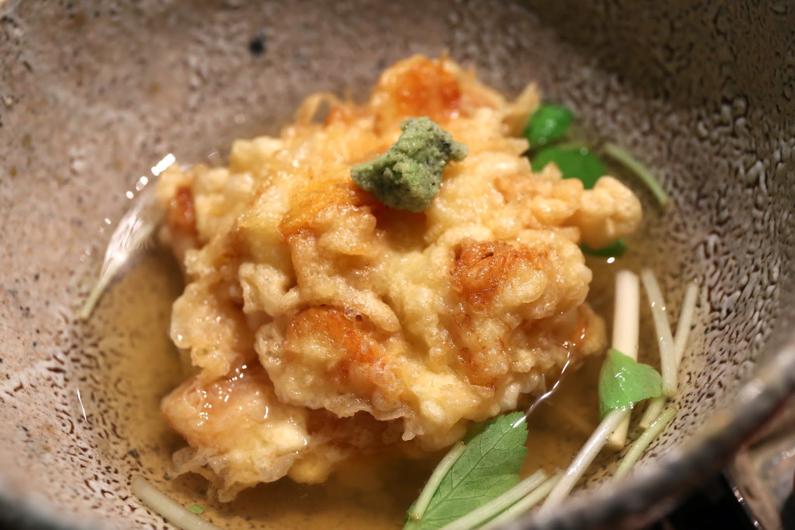 We started with a little bit of Japanese yam (山芋) with miso, greens with shaved bonito, and some dried fish. Then the procession of tempura began...
