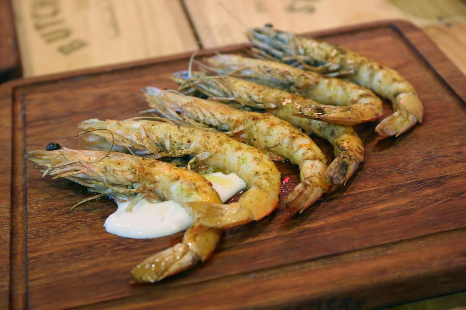 Spiced rubbed and grilled Spencer Gulf jumbo king prawns - with bay leaves and served with horseradish crème fraîche. Pretty nice.